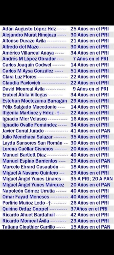 -Morena ha incorporado a figuras con carrera larga en el PRI (y algunas del PAN/PRD), muchas con décadas en el sistema tradicional.